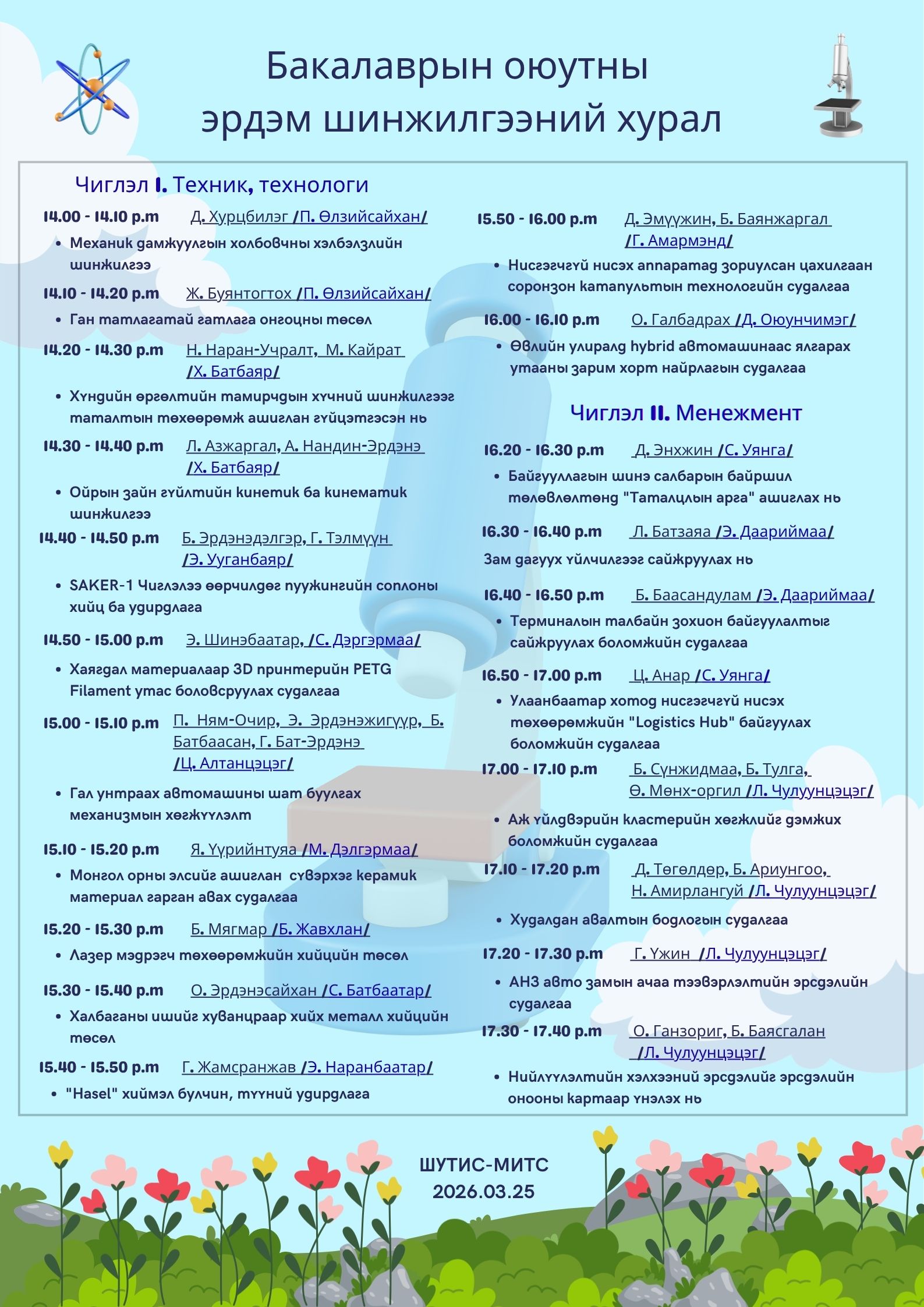 Хуралд техник, технологийн чиглэлээр 13 илтгэл, менежментийн чиглэлээр 10 илтгэл амжилттай хэлэлцэгдэж, оюутнууд судалгааны шинэлэг байдал, инженерийн шийдэл, инноваци, практик ач холбогдол, илтгэх ур чадвараараа өрсөлдлөө.