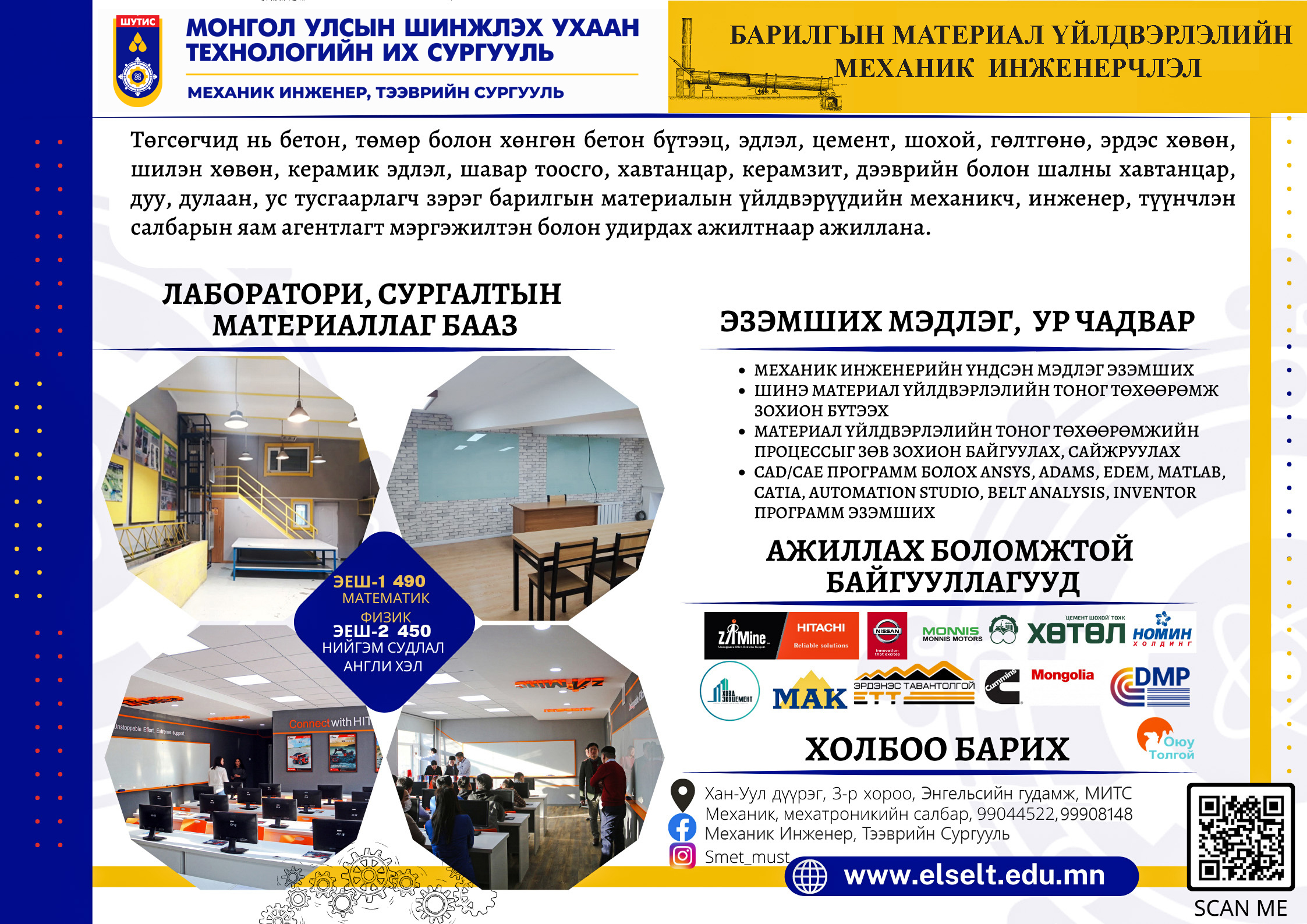 Тус хөтөлбөр нь барилгын хийц эдлэл, материалын дэвшилтэт үйлдвэрлэлийн салбарт ашиглагддаг машин төхөөрөмжийг зохион бүтээх, угсралт, суурилуулалт, ашиглалт, засвар, техникийн үйлчилгээ, оношлолыг уламжлалт арга болон хиймэл оюун (AI) ашиглан иж бүрэн гүйцэтгэх, зохион байгуулах чадвартай МЕХАНИК ИНЖЕНЕР болж бэлдэхэд оршино.